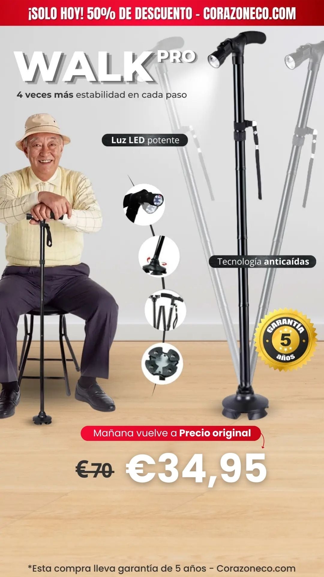 Esta es el único bastón inteligente con 4 puntos de apoyo que te permite descansar la rodilla, tener mas equilibrio y destacar con tu bastón